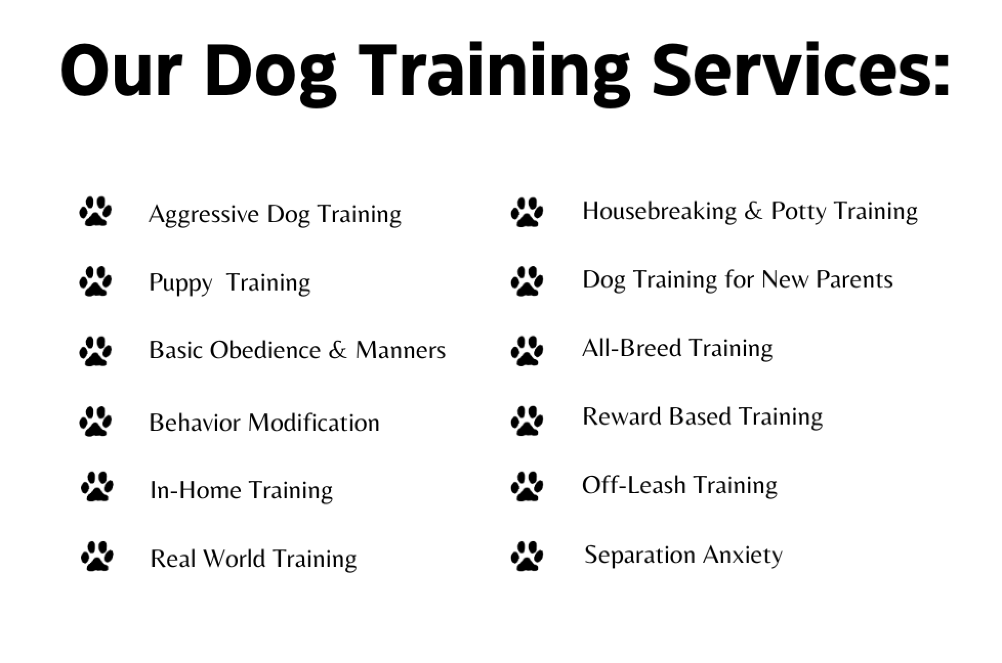 We do NOT offer group classes, board and train, or therapy dog training.